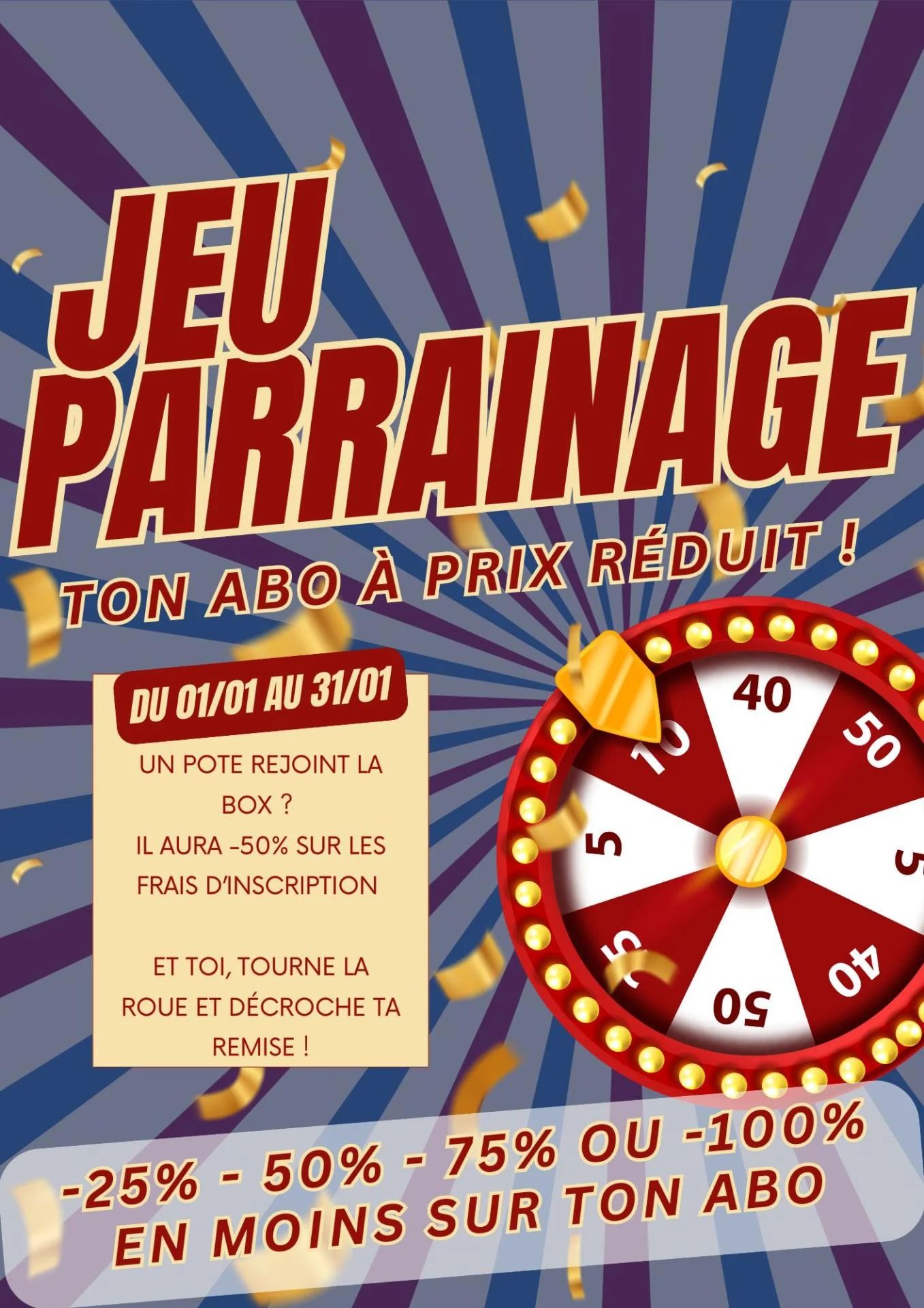Si tu parraines ensuite un proche et qu’il s’inscrit à l’année, tu pourras gagner une réduction sur ta prochaine mensualité, de -25 % jusqu’à un mois gratuit.